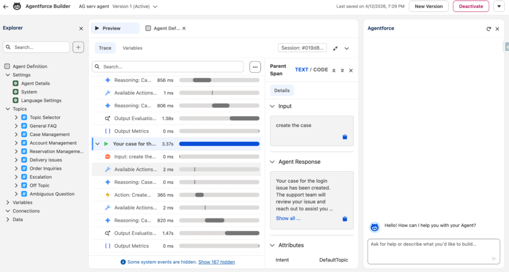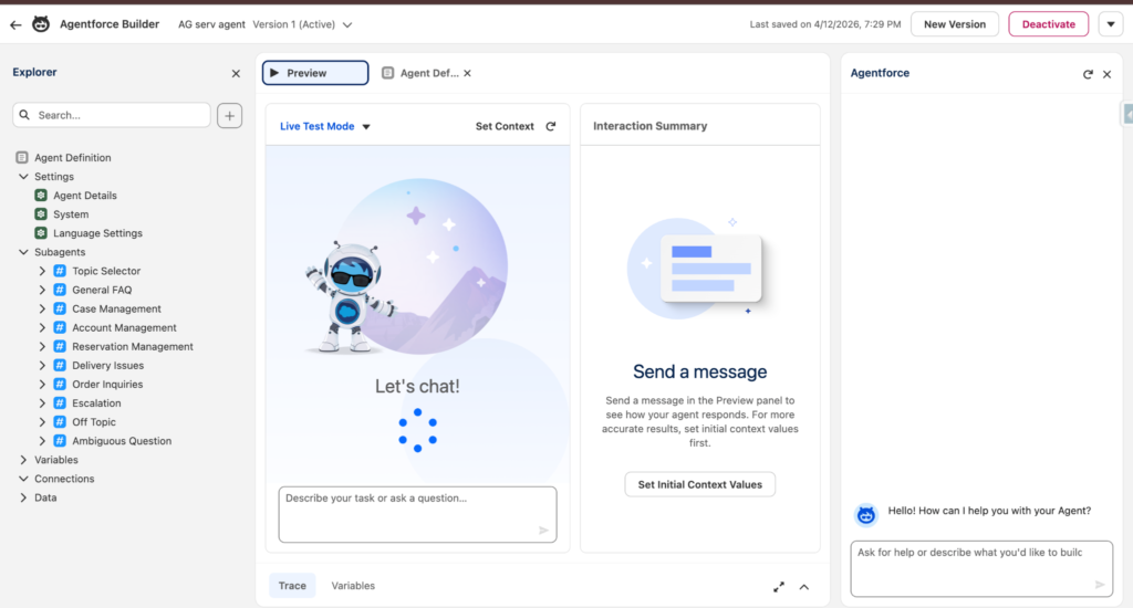 The new Agentforce Builder is a completely rebuilt interface for creating and managing agents. The biggest structural change is that everything now lives in a single workspace. The old builder split Topics, Actions, Testing and Settings across separate tabs, which meant constant context switching.The Explorer sidebar now gives you a flat, navigable tree of your entire agent including subagents, actions, variables and connections, all visible at once.