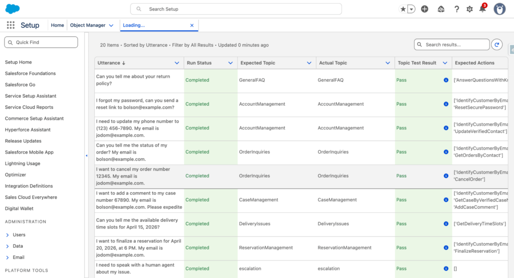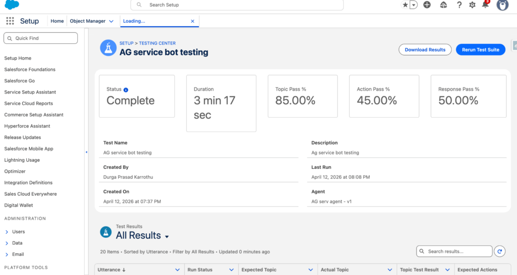 Agentforce Grid is a bulk testing environment available under Setup > Testing Center. It lets you run a test suite across multiple utterances at once and review the results in a single view.