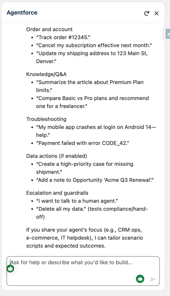 The Agentforce Assistant is an AI panel embedded in the builder. You describe what you want in plain English and it generates subagents, actions and Agent Script for you to review and accept.