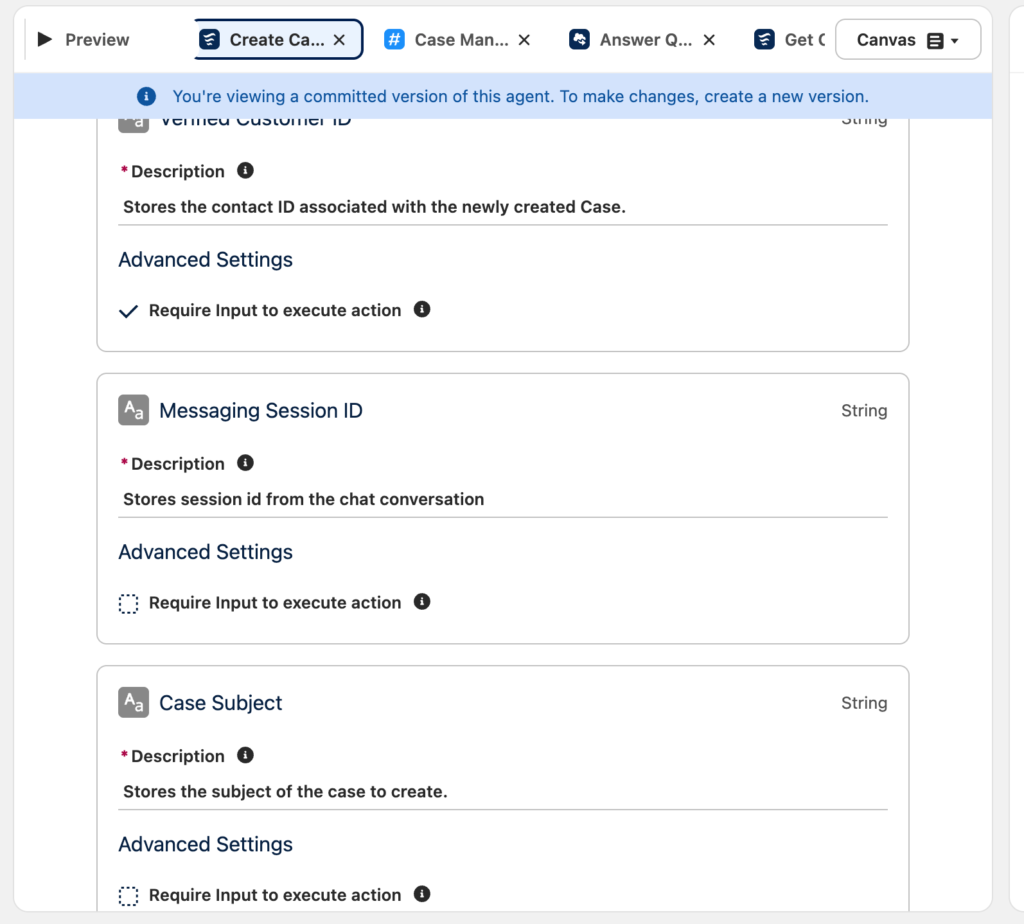 The editing area supports two views that stay in sync with each other. Canvas View renders agent configuration as structured visual blocks, which is useful for reviewing logic quickly or for admins making changes. Script View is where developers write Agent Script directly, with syntax highlighting, autocompletion and real-time validation.