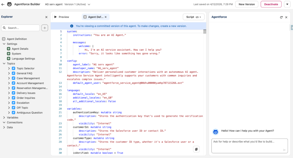 Agent Script is version-controlled metadata. That means pull requests, code reviews and rollbacks apply to agent logic the same way they apply to Apex classes and other org metadata.